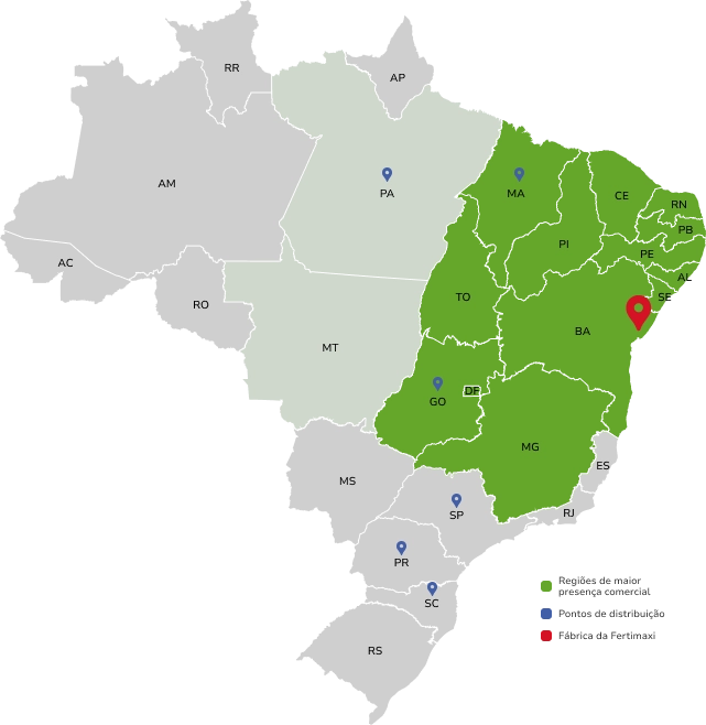Com unidade fabril localizada na cidade de Conceição do Jacuípe (BA), a Fertimaxi conta com pontos de distribuição estrategicamente posicionados em outras regiões do Brasil, próximos a portos, incluindo: Barcarena e Miritituba (PA), São Luís (MA), Cubatão (SP), Paranaguá (PR), São Francisco do Sul (SC), Catalão (GO).