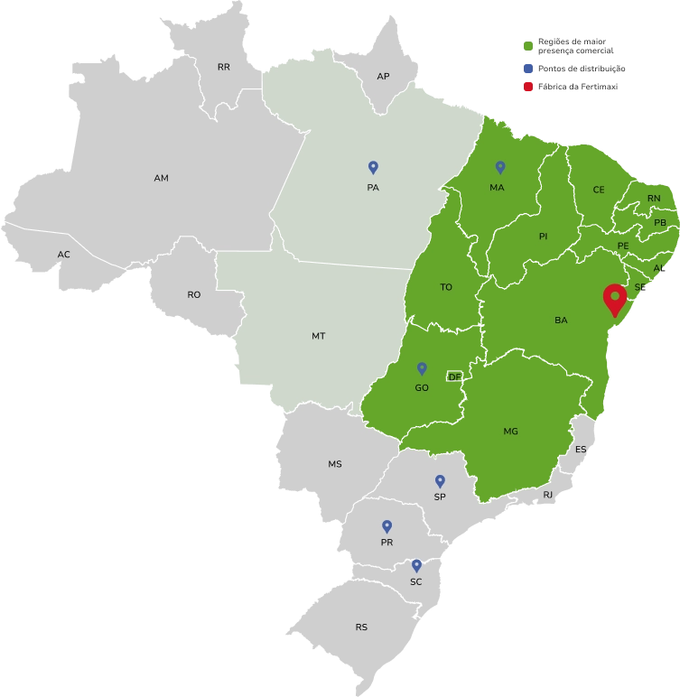 Com unidade fabril localizada na cidade de Conceição do Jacuípe, Bahia, a empresa opera de forma estratégica próxima aos principais portos do estado. Essa posição geográfica privilegiada permite a importação eficiente das matérias-primas utilizadas na produção de fertilizantes e facilita o escoamento para os principais mercados do Nordeste, reforçando a competitividade logística e a agilidade no atendimento aos clientes da região.